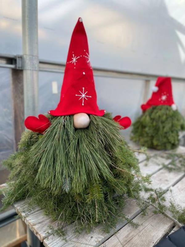 This adorable gnome will greet your front porch visitors with a friendly wave. Price includes hat, mittens, nose and greens harvested from the Bitterroot National Forest. Additional greens and accessories will be available for purchase if desired.